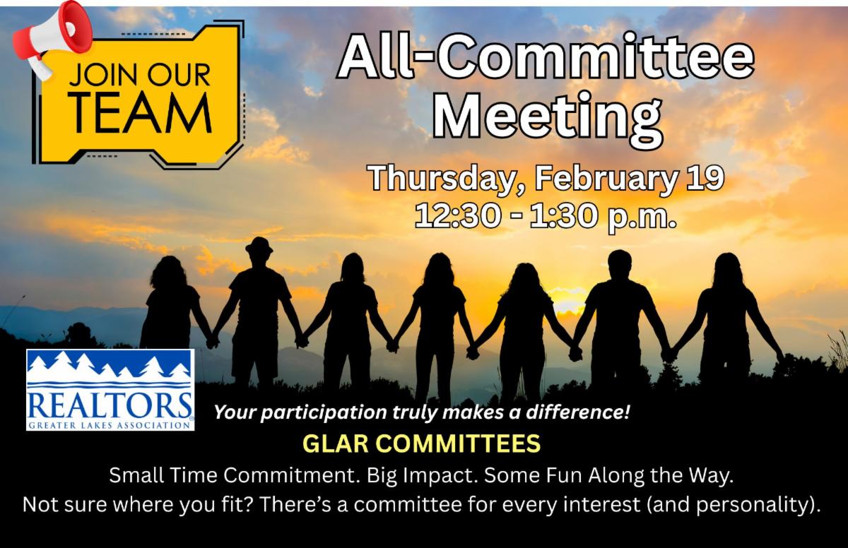 19 Feb All Committee Meeting 2026 All Committee Meeting 2026 Thursday, February 19, 2026 (12:30 PM to 1:30 PM) Greater Lakes Association of REALTORS® Office Details You're Registered! DescriptionLocation Small Time Commitment. Big Impact. Some fun along the way. Not sure where you fit in? There's a committee for every interest (and personality). Greater Lakes Association of REALTORS® Office 15344 Pearl DriveBaxter, MN 56425 Map & Directions